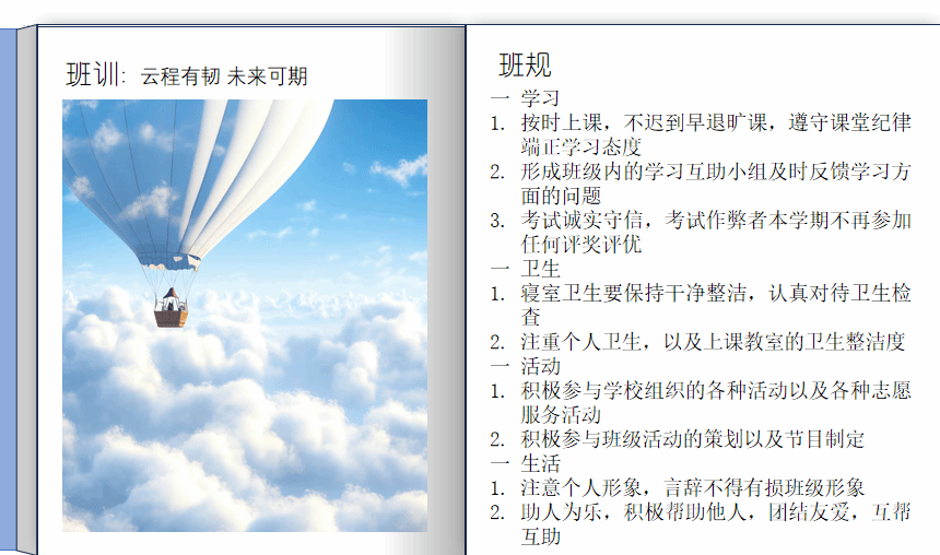 各班级广纳集体意见,制定出符合班级风格的班训、班级公约,班级同学通过班委会拟定初稿、分析校规校纪、召开班会宣讲展示、全班学生投票定稿等方式进行了参与。2023级应用统计学班班训为云程有韧,未来可期,制定的班级公约涵盖了课堂纪律、寝室卫生、同学日常相处等多个方面,内容详细具体,覆盖面广。
