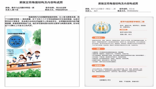 班级海报设计作为新生班级文化系列活动之一,需要班级同学集思广益,合理分工,设计出能凝练专业特色,展示班级风格的宣传海报。在班级海报展示中,应用统计学专业班徽以蓝色为主色调,展现出统计专业的严谨;经济统计学专业班徽选用了蓝色、绿色、橙色,展示出学科的活力和创新;数学与应用数学专业采用书籍、学生、麦穗、星星、圆为主要设计元素,展现出师范专业特色。