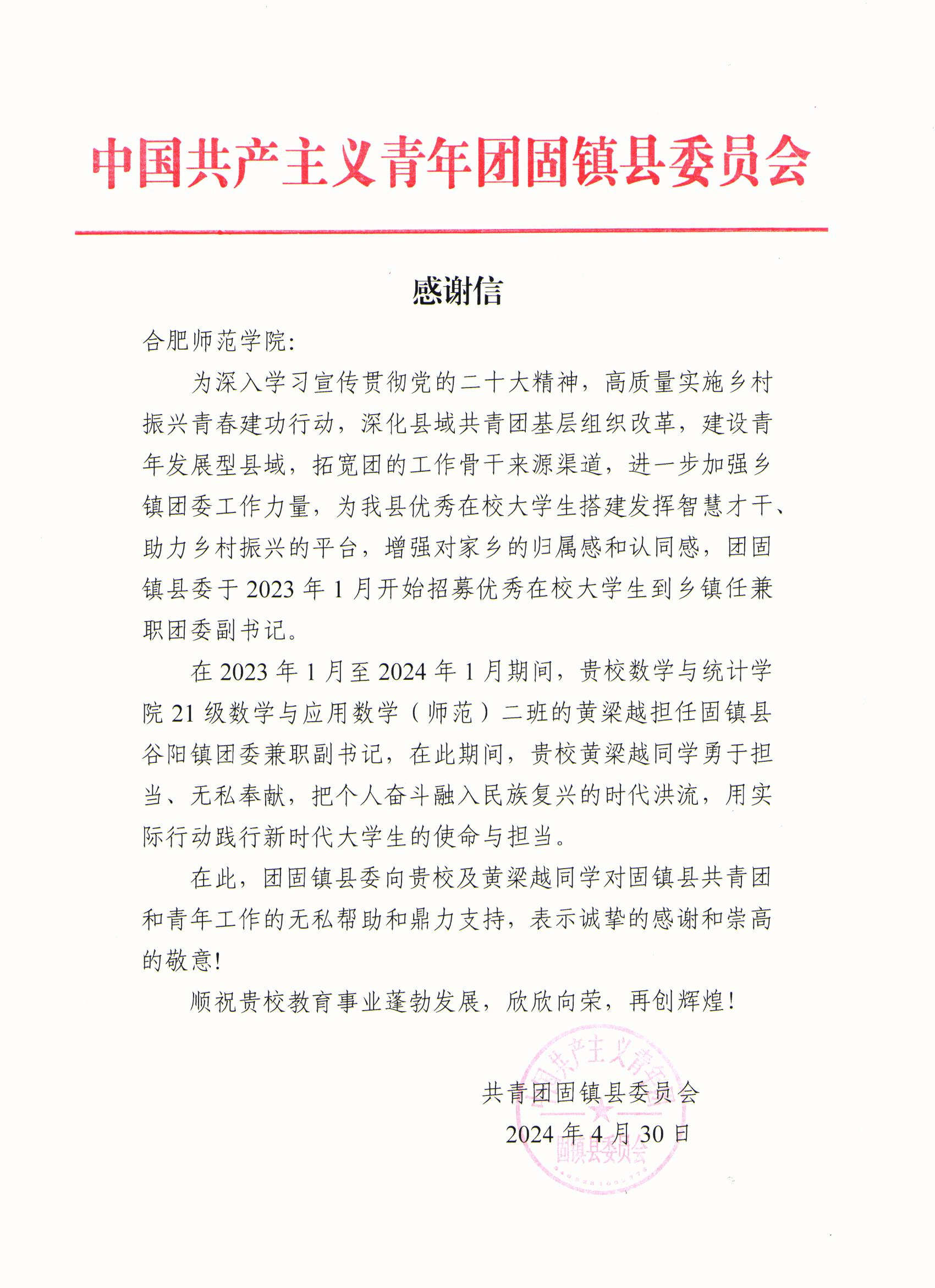 近日,学校收到共青团固镇县委员会发来的感谢信,对学校亚洲爆乳无码精品AAA片2021级数学与应用数学(师范)2班黄梁越同学在担任固镇县谷阳镇兼职副书记期间的良好表现给予了高度赞扬,并由衷地感谢学校对固镇县共青团及青年工作的帮助与支持。