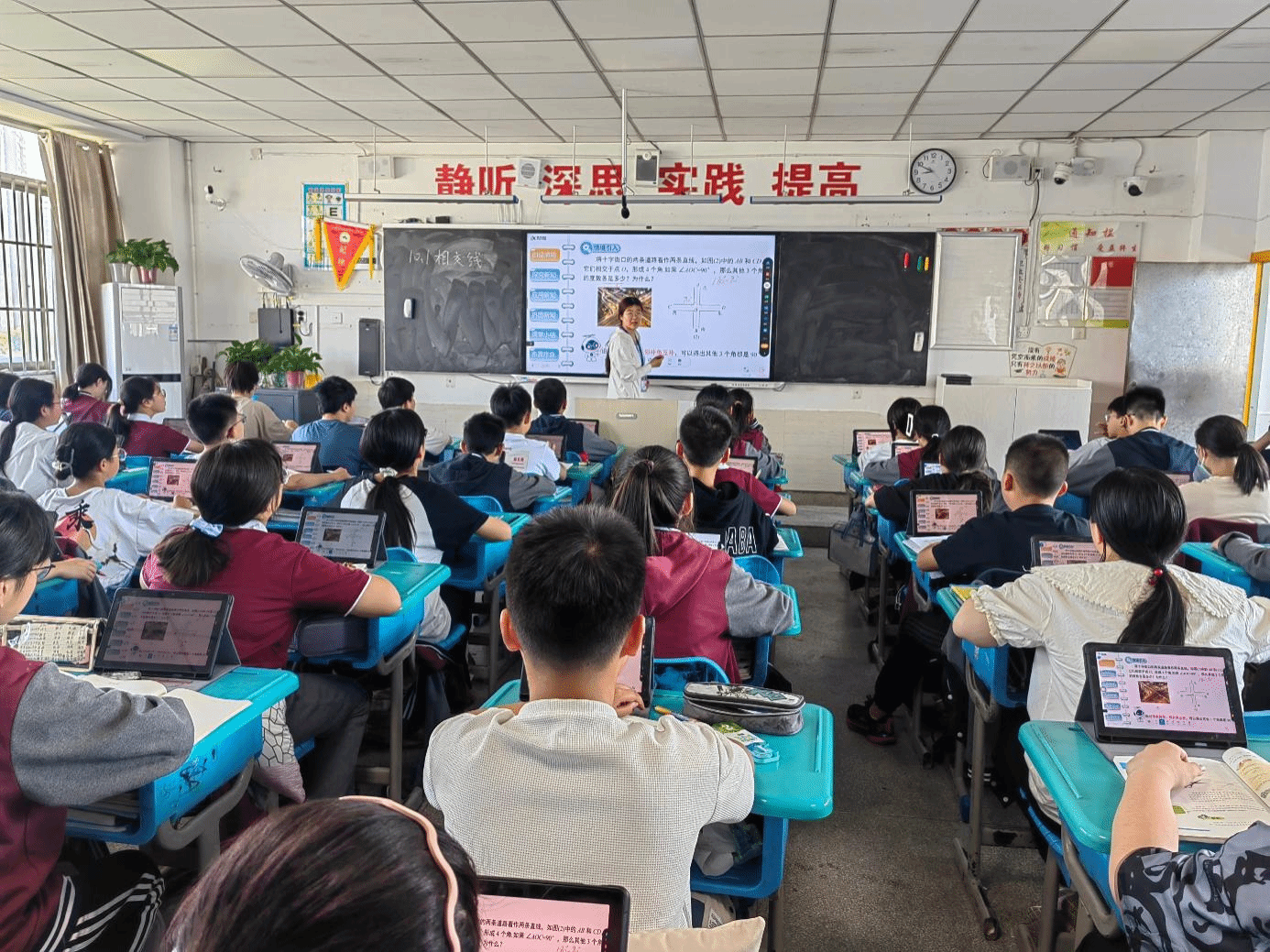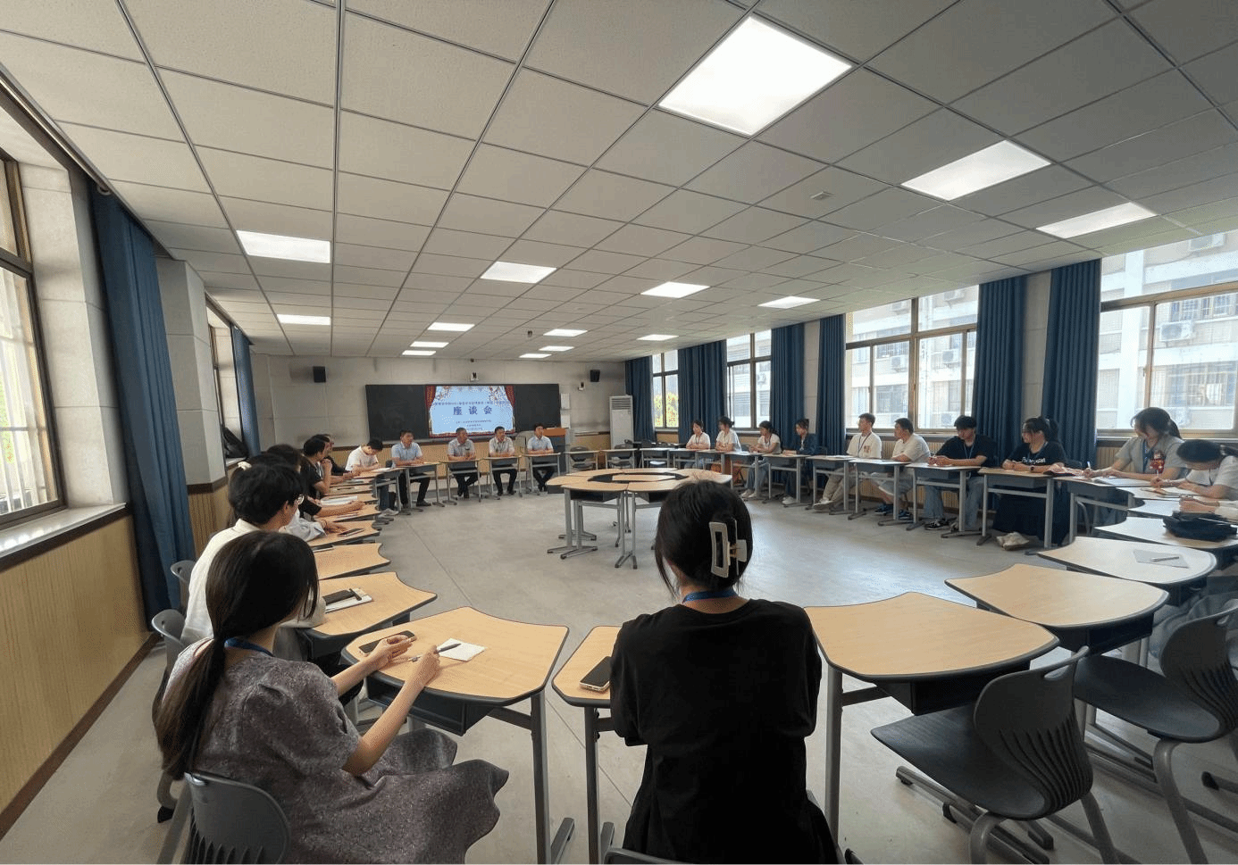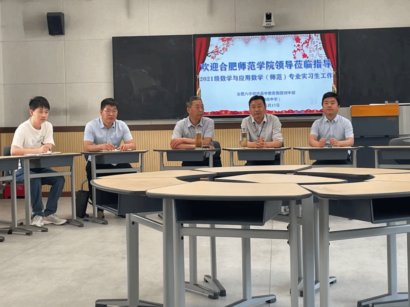 肥西上派初级中学党委书记汪东、教导处主任周稳热情接待了学院一行,并共同听了2021级数学与应用数学专业曹桠菲同学上的公开课《相交线》,课后召开了实习生座谈会。