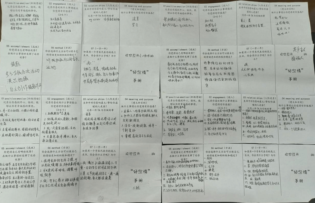 “积极心理学之父”马丁·塞利格曼《持续的幸福》中提出幸福包含积极的情绪、投入、人际关系、意义、成就感五个部分。根据马丁·塞利格曼的PERMA幸福观,学生们现场制作“好心情”练习手册,增进积极的心态,培养学生主动去觉察、创造好心情。