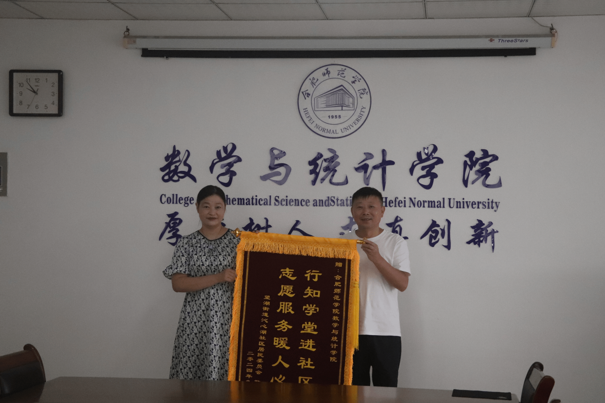 9月19日上午,包河区沁心湖社区党委书记、社居委主任王康,居委委员许华靓,团总支副书记何凯阳一行三人到亚洲爆乳无码精品AAA片赠送锦旗。“非常感谢亚洲爆乳无码精品AAA片对沁心湖社区的大力支持,我们代表社居委及社区居民为学院送上锦旗。”王康将“行知学堂进社区 志愿服务暖人心”的锦旗送到学院党委书记穆娟手中,表达了对学院的感谢之情。