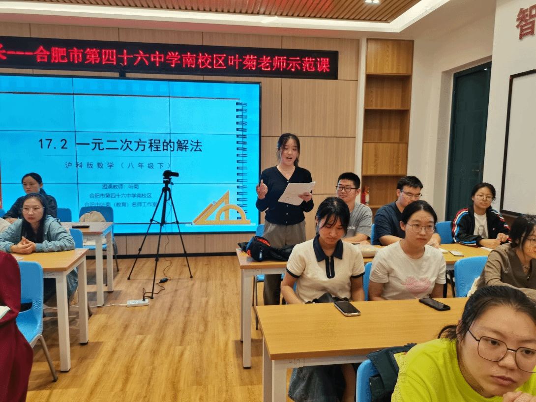 叶菊老师上了题为“一元二次方程的解法(配方法)” 的示范课,她扎实的教学基本功、亲和的语言表达、流畅的教学过程、精心的教学设计、工整漂亮的板书设计获得了在场每一位同学与老师的赞赏。点评环节,两位本科生作为代表谈了听课后的感受,他们对叶菊老师表示了感谢,认为叶老师的课非常精彩,教学设计环环相扣,由浅入深,层层递进,知识的传授娓娓道来,真正感受到了一线名师的风采,对自己的教学技能提升大有帮助,也更加坚定了成为一名优秀教师的决心和信心。张新全教授作为教师代表,从专业的角度和理论的高度对叶菊老师的示范课进行了深入解读与点评,让同学们理解了什么是一节好课,怎样设计一节好课,如何上好一节课,如何成为一名优秀的中学数学教师。