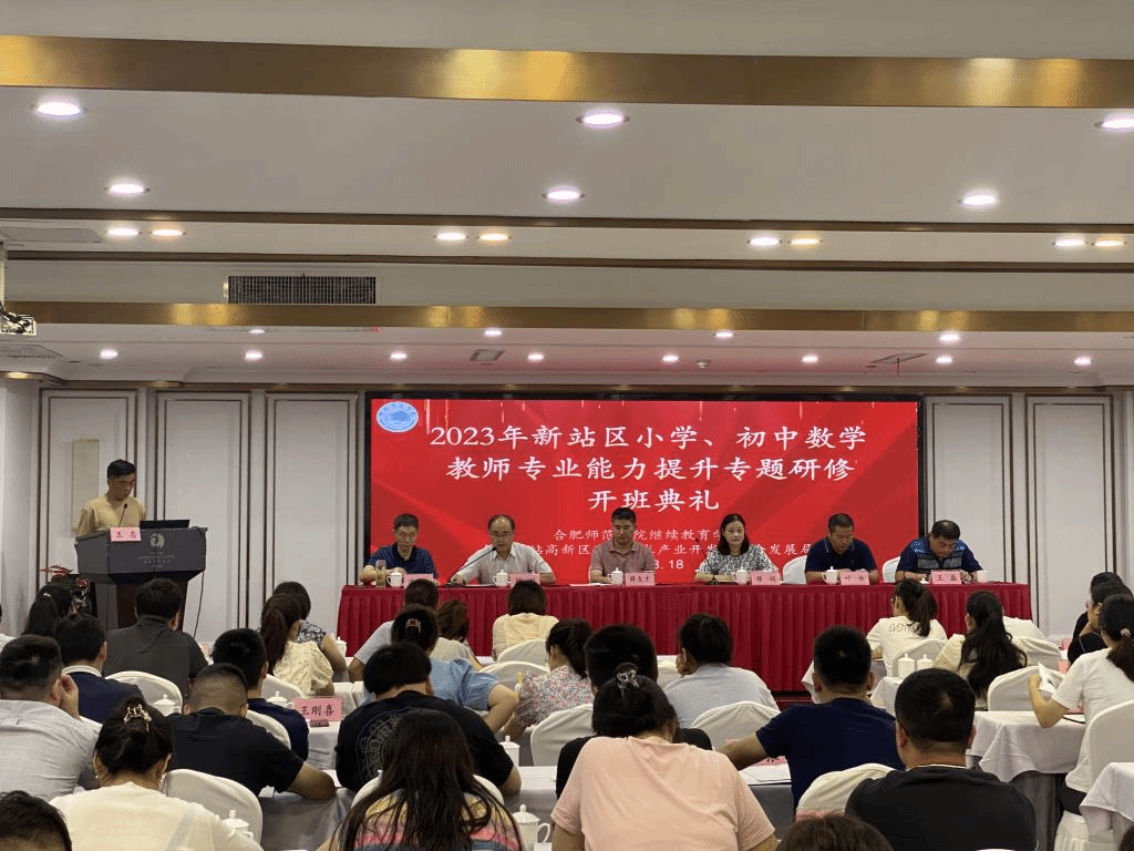 本网讯 2023年8月18日上午,由合肥师范学院承办的合肥新站区小学、初中数学教师能力提升专题研修班在源牌国际酒店举行开班典礼,亚洲爆乳无码精品AAA片党委书记穆娟、新站区教研室小学数学教研员薛友才、初中数学教研员叶余、亚洲爆乳无码精品AAA片副院长杨刘、继续教育学院副院长王磊、项目执行负责人沈南山以及全体参训学员出席了典礼,典礼由班主任王志主持。