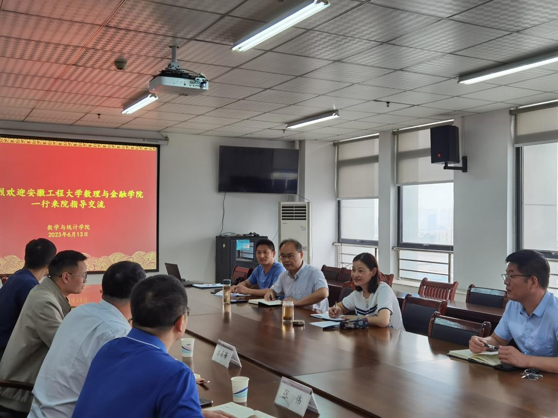 本网讯 6月13日,安徽工程大学数理与金融学院副院长潘海峰、副院长张培雨、统计学系主任张伟、青年博士李军一行来亚洲爆乳无码精品AAA片开展调研交流和研究生招生宣传。学院党委书记穆娟、副院长杨刘、副书记陶金昌、党委委员肖云刚、统计系负责人出席交流会。