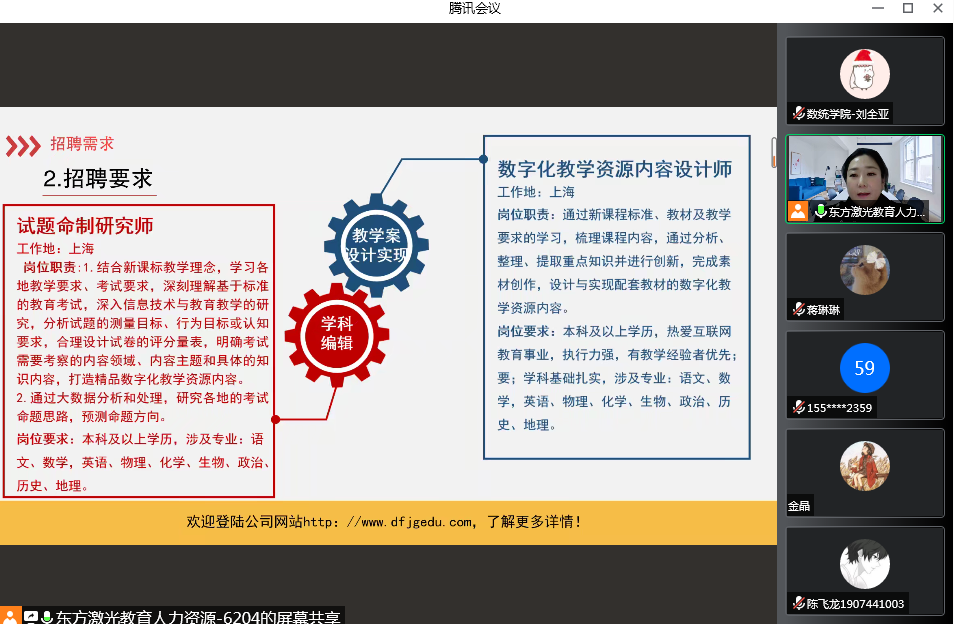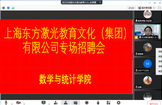 本网讯 为进一步加深校企合作,拓宽毕业生就业渠道,亚洲爆乳无码精品AAA片近期邀请了上海东方激光教育文化(集团)有限公司开展线上专场招聘会。近60余名2023届毕业生参加,线上招聘会由毕业班辅导员刘全亚主持。