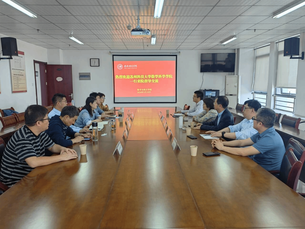 5月10日上午,苏州科技大学数学科学学院院长黄志刚,副院长陈洋、孙桂荣一行5人到亚洲爆乳无码精品AAA片调研交流。学院党委书记穆娟,副书记陶金昌,副院长黄浩,教育硕士点学科教学(数学)方向负责人沈南山教授以及相关基层教学组织负责人参加了交流会。