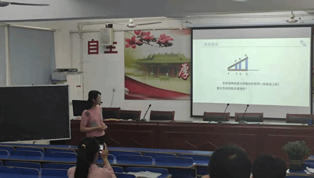 随后,由肥西县上派初级中学数学教师、卫德彬初中数学名师工作室成员、合肥市青年教师教学技能比赛一等奖获得者刘清清老师进行无生上课、说课《正切》。刘老师通过生活实例——桥的建造引入,抽象出其中蕴含的数学问题,形成正切的概念。运用深厚的文学功底和优美的语言向实习生们展示了一节精彩的无生上课和完整的说课流程,令实习生们收获颇丰。