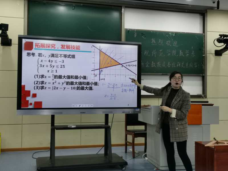 董洁老师讲授了《线性规划的简单应用》这节内容,她以“某工厂的日生产安排”的案例为引例,总结出线性规划的基础概念。随后,董洁老师通过一道例题主要讲解了线性目标函数可能出现的几种情况,在此基础上再对非线性目标函数进行探究。董洁老师在教学的过程中,注重以学生为本,精心设计了一系列线性规划问题,由浅入深地引导学生进行思考,活跃课堂气氛,获得了听课老师一致好评。