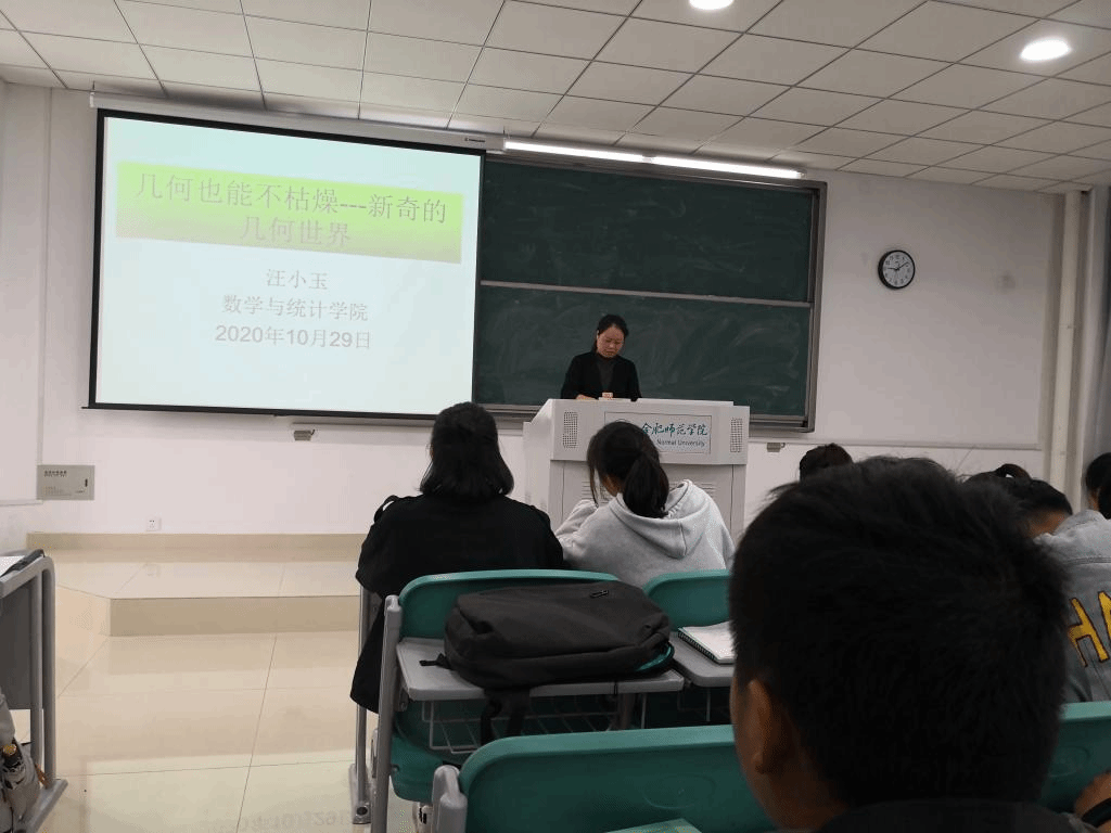 本网讯 2020年10月29日上午,我院汪小玉老师在滨湖校区博学楼A203教室,为我校学生作了一场题为“几何也能不枯燥----新奇的几何世界”的报告。