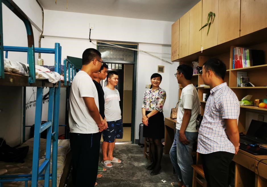 校长方东玲带领学生处、财务处等部门负责人走访慰问了报到的新生并表达了对学生的亲切关怀与殷切希望,对学生党员志愿者的热情服务给予高度肯定。
