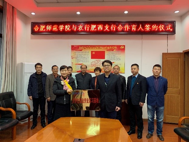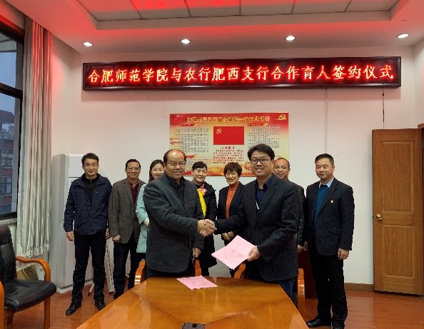 本网讯 11月25日下午,合肥师范学院亚洲爆乳无码精品AAA片与中国农业银行(肥西县支行)合作育人签约、基地挂牌仪式在农行肥西支行会议室举行。中国农业银行(肥西县支行)党委书记、行长徐勇,副行长丁敏、方旭东、秦忠、肖刚,学院党总支书记郑支农、院长王家正、副书记穆娟、万家练教授、教工第二党支部书记、金融工程系主任齐继兵等出席了签约仪式,签约仪式由副行长方旭东主持。