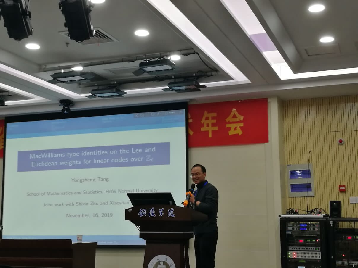 本次会议由安徽省数学会主办,铜陵学院承办,会议吸引了包括来自中国科学技术大学在内的省内各高校和部分中学共计四百余名代表参加,针对大学数学教学与科研、大学数学基础课程建设,并就目前数学研究与教育中的热点问题进行了广泛研讨。学术年会开幕式进行了第四届安徽省青年数学奖颁奖仪式。大会邀请了东北师范大学史宁中教授和中国科学技术大学叶向东教授分别作了"高中数学中的概率统计"和"动力系统在组合数学中的应用"大会报告。16日下午,小组会议分成高校教学类专题、高校科研类专题和中学组专题分别进行报告交流。我校唐永生博士在高校组科研类专题组作了题为“MacWilliams type identities on the Lee and Euclidean weights for linear codes over Zl”的学术交流分组报告,并与同行作了广泛交流。中学组在铜陵市第一中学进行了分组报告与研讨。我校张新全老师全程参与交流。