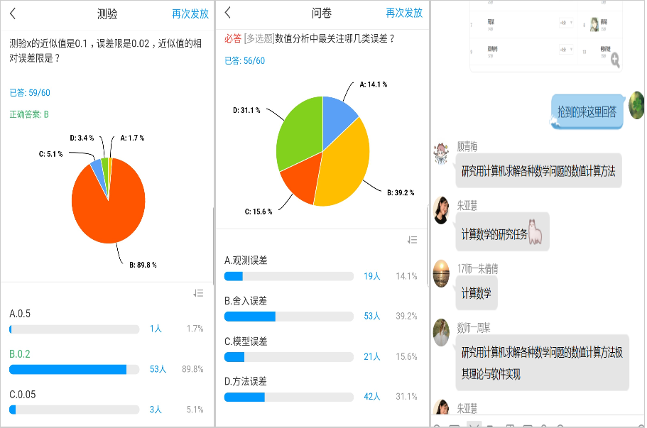一是考虑平台功能,比如是否具有签到、抢答、分组、讨论等课堂互动功能。二是考虑平台对学生和教师的易上手程度。三是考虑课程库里可参考的课程资源。在充分了解众多平台后,我选择了超星泛雅课程教学平台。该平台不仅具有课堂互动所需要基本功能,操作简便,更重要的是大部分学生都有过使用“学习通”的经历。而且“学习通”的客服也会及时反馈咨询的问题。我教的《数值分析》是专业课,课程库里的资源不像基础课那么丰富,无论哪个课程库里都很难找到匹配特别好的课程,所以这方面影响不大 。为了让我们尽快熟悉平台的操作过程,我校在“学习通”上建立了班级,并安排了一些优秀的教师给我们做培训,比如钱莉娜老师就给我们上一堂精彩的线上直播课。她在课程的录制、课程互动环节的设置,学生成绩的设置等方面给我们做了详细的介绍,并针对线上课堂的师生互动,如问卷、分组讨论、签到、抢答等功能给我们做了现场的互动演示。听了钱老师的课,受益颇多,不仅让我掌握了学习通的使用方法,也坚定了上好网课的信心。