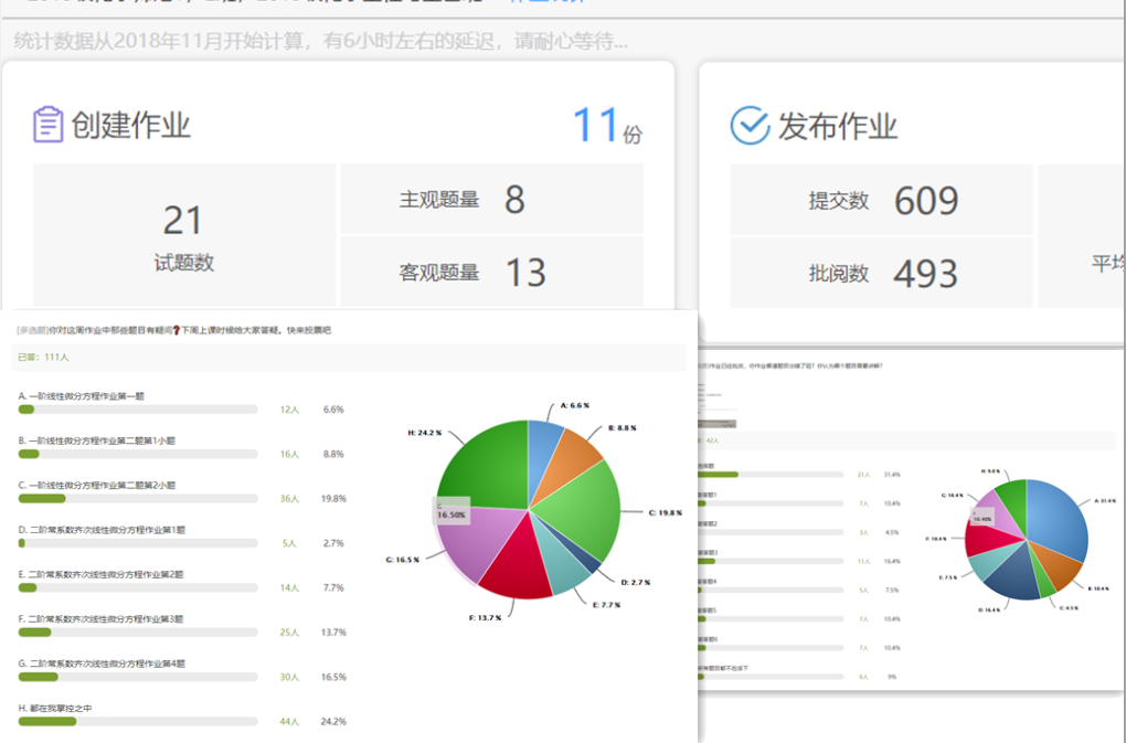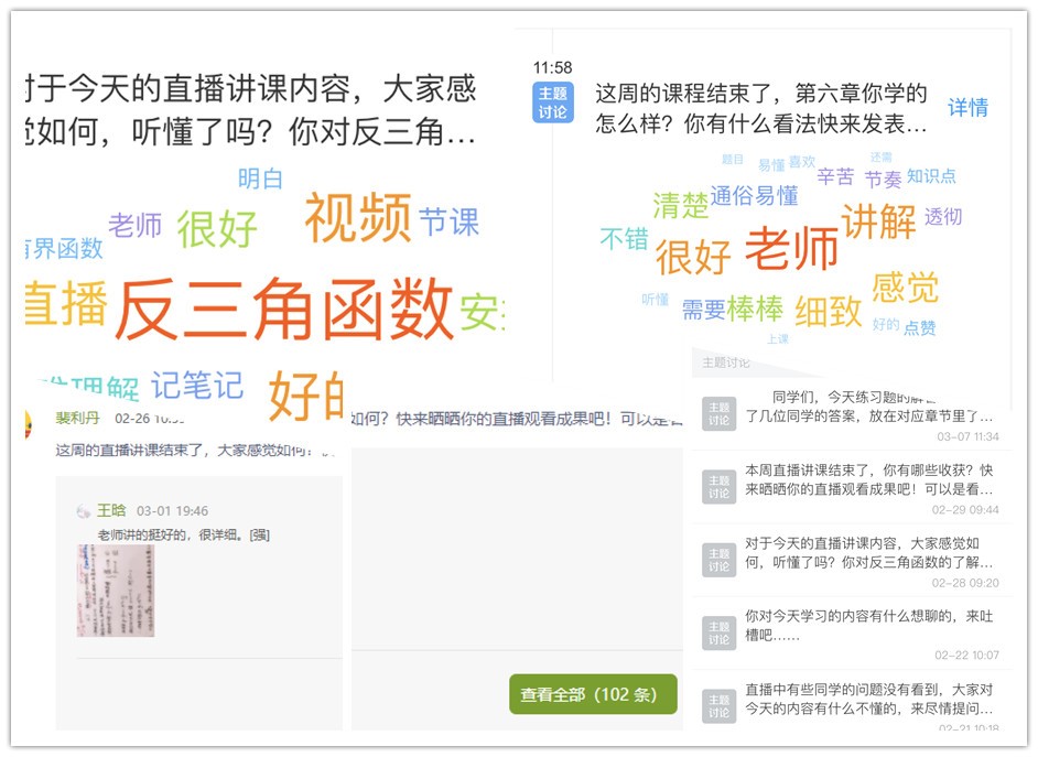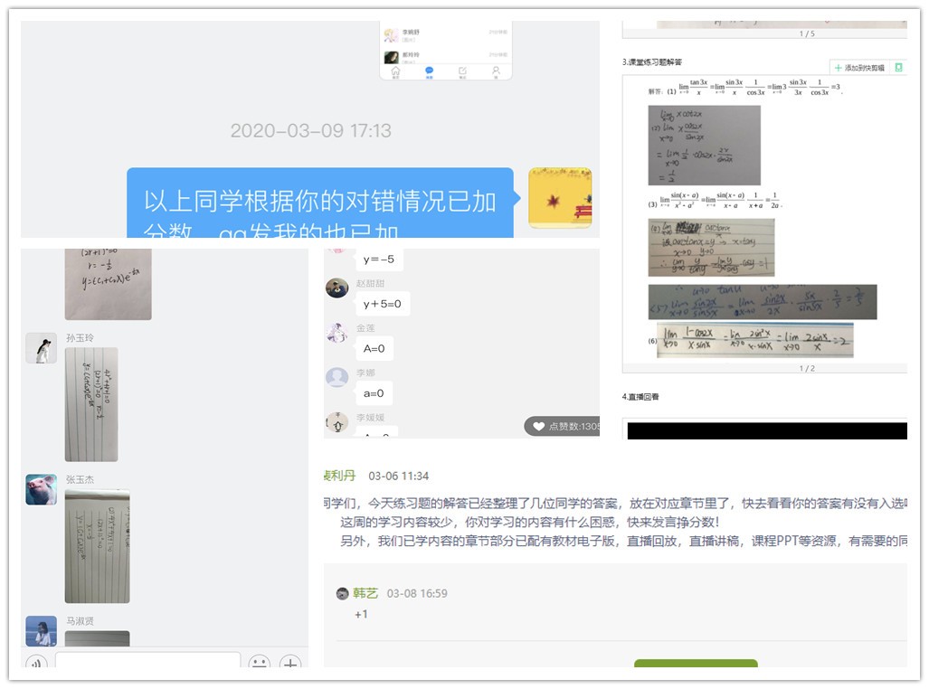 高等数学有很多需要计算及学生练习的内容,为方便学生学习。在直播中我会将所学内容详细写成讲稿,并且每次课后将讲稿整理成电子文档,与直播回放资源一起上传至学习通平台供学生复习巩固使用。在学习通平台建立各章节以“教材电子版+PPT+直播回放+直播授课讲稿”为主的四大教学资源,辅以“测验+作业+问卷+讨论”及时了解并反馈学生疑难知识点,学生的学习任务普遍完成不错。