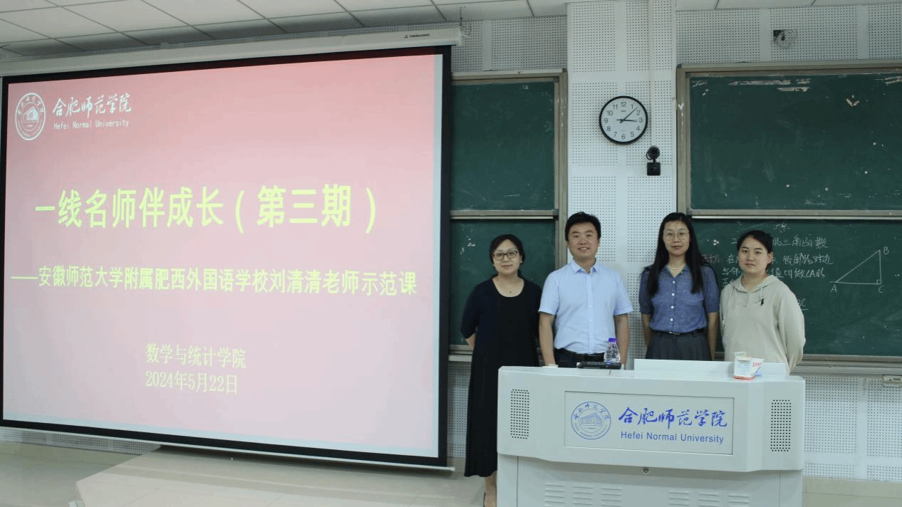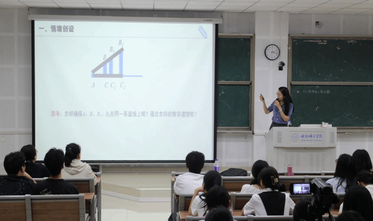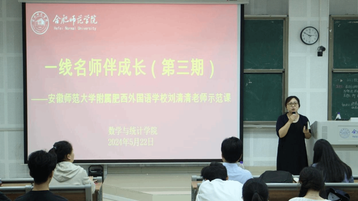 为落实“学生中心”理念,提升数学师范生教学技能,做好省级、校级师范生教学技能竞赛赛前辅导,5月22日下午,亚洲爆乳无码精品AAA片在滨湖校区博学楼A108教室举办了“一线名师伴成长”第三期活动。此次活动邀请了合肥市金牌职工、合肥市教坛新星、合肥市优质课一等奖获得者、肥西县初中数学名师工作室领衔人、安徽师范大学附属肥西外国语学校的刘清清老师为数学专业师范生上了一堂初中数学示范课,并做了师范生教学技能辅导讲座。亚洲爆乳无码精品AAA片副院长黄浩、数学课程与教学论教师栾庆芳、辅导员刘全亚,2022级、2023级共278位数学与应用数学(师范)专业的学生参加了本次活动,活动由副院长黄浩主持。