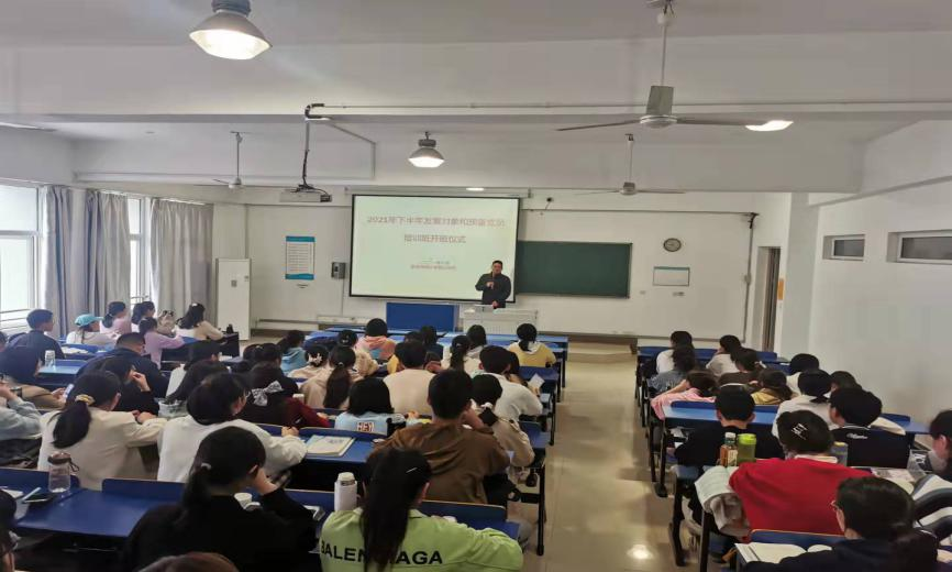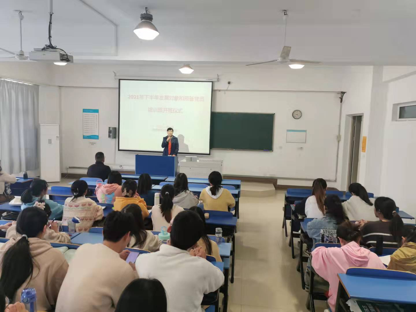 本网讯 2021年10月26日,亚洲爆乳无码精品AAA片分党校2021年下半年发展对象与预备党员培训班在锦绣校区逸夫楼A406举行,亚洲爆乳无码精品AAA片党委书记郑支农、党委副书记陶金昌,88名发展对象和预备党员参加了开班仪式,仪式由学生党支部书记杨尔飞主持。