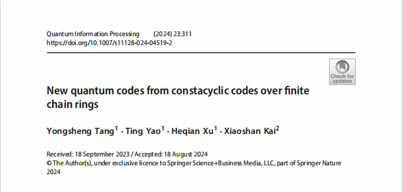 近期,亚洲爆乳无码精品AAA片“基础数学”省级重点学科代数编码团队唐永生、许和乾、姚婷在量子纠错码构造方向取得进展,相关成果New quantum codes from constacyclic codes over finite chain rings在JCR二区期刊《Quantum Information Processing》公开发表。