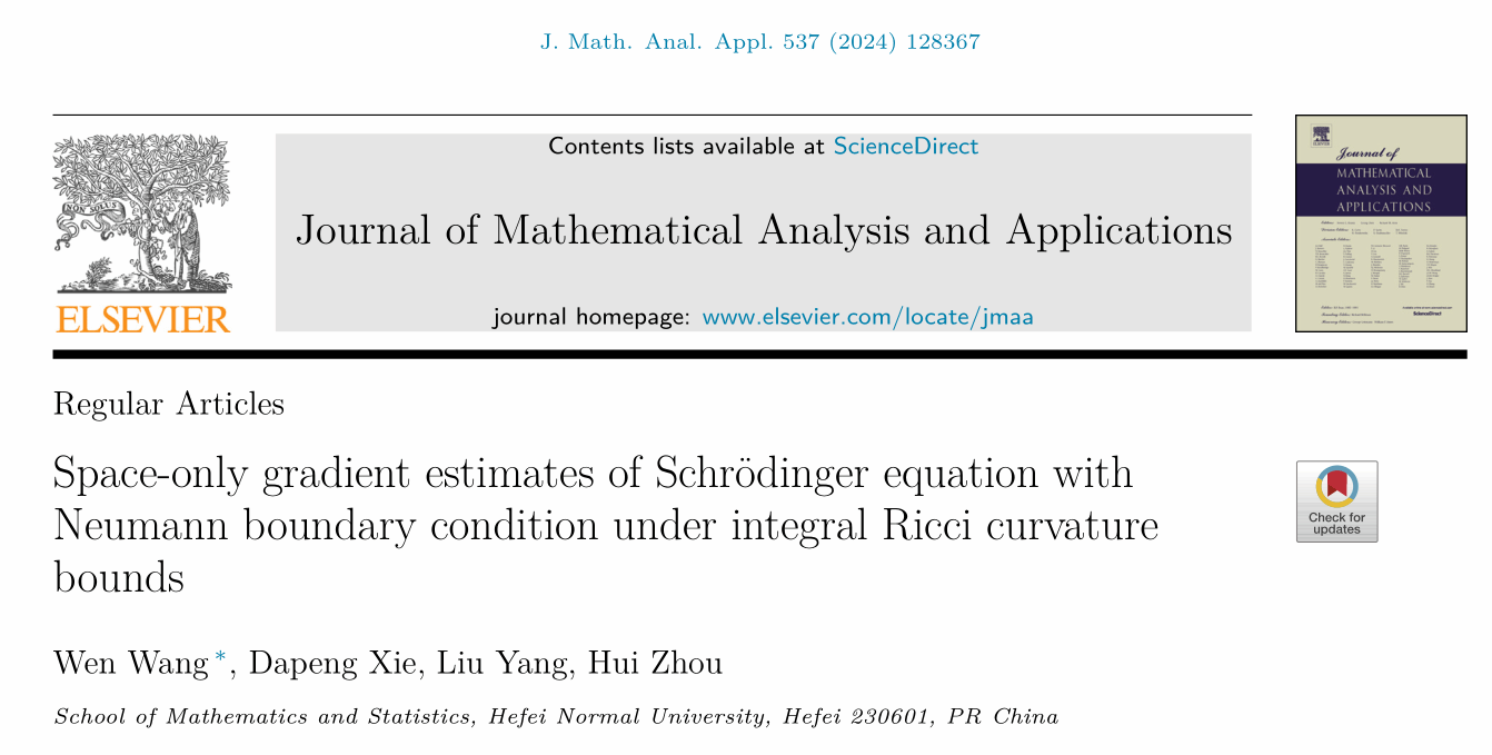 近期,亚洲爆乳无码精品AAA片“基础数学”省级重点学科微分方程与动力系统团队教师王文、解大鹏、杨刘、周辉在几何偏微分方程方向取得进展,相关成果Space-only gradient estimates of Schrödinger equation with Neumann boundary condition under integral Ricci curvature bounds在JCR二区期刊《Journal of Mathematical Analysis and Applications》公开发表。