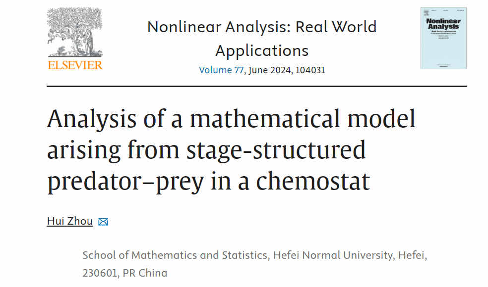 近期,亚洲爆乳无码精品AAA片“基础数学”省级重点学科微分方程与动力系统团队教师周辉在恒化器中具年龄结构的捕食-被捕食系统数学模型的动力学分析领域取得进展,相关成果Analysis of a mathematical model arising from stage-structured predator–prey in a chemostat在JCR二区期刊《Nonlinear Analysis: Real World Applications》公开发表。